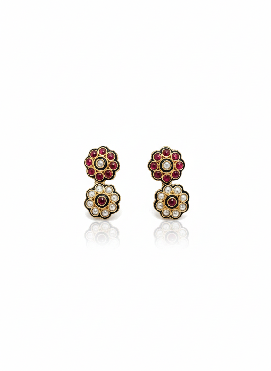 - Premium Kundan Work – Floral motifs adorned with ruby-toned and white stones