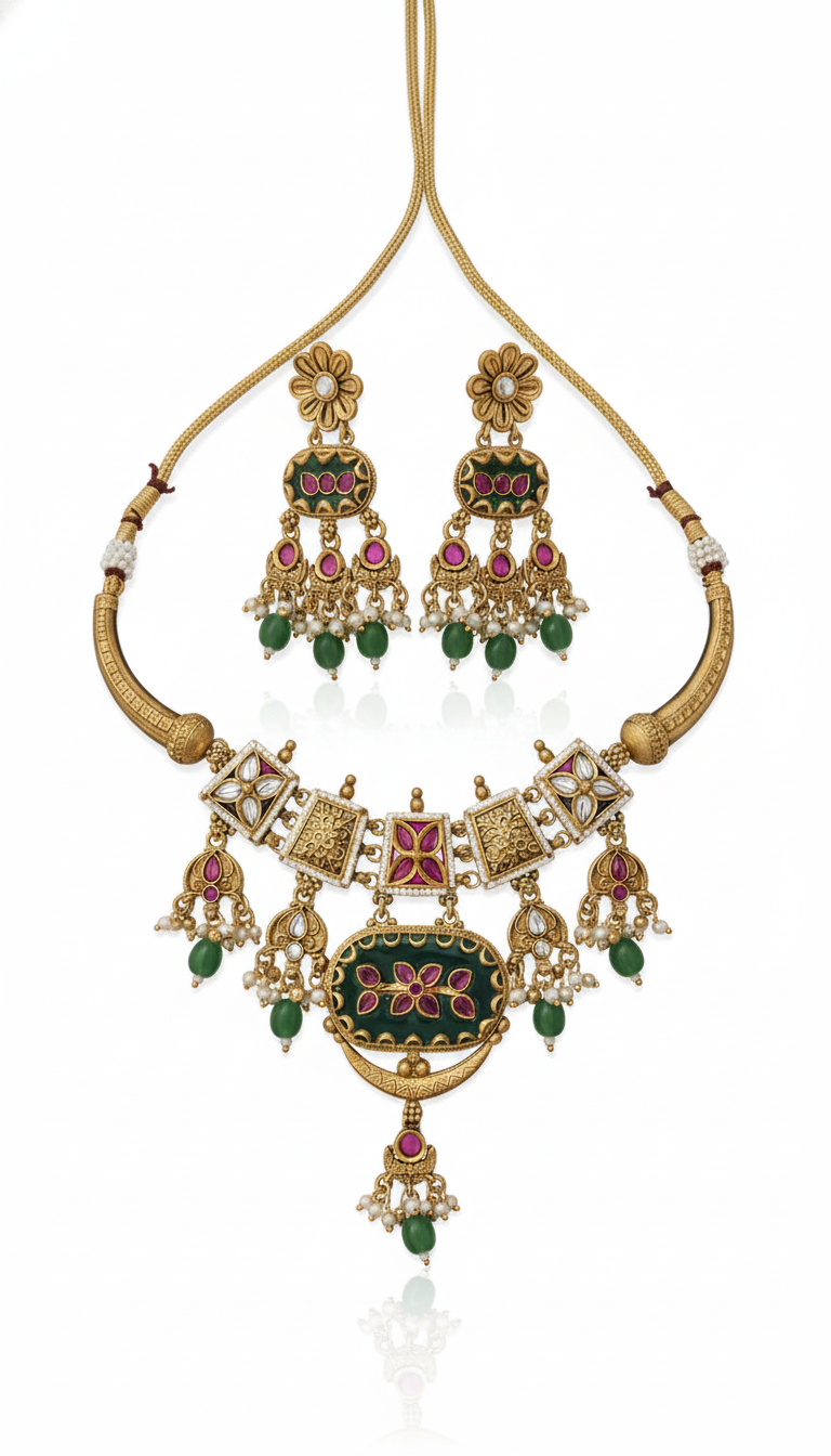 A stunning temple-style hasli set crafted with traditional detailing, ruby-green stones, and a rich high-gold polish. The intricate motifs and pearl accents add a royal charm—perfect for weddings, festive functions, and traditional outfits.