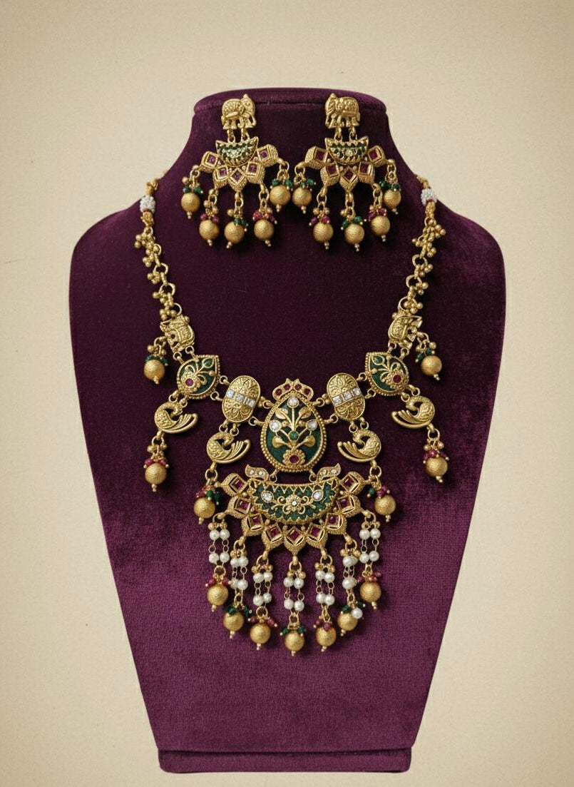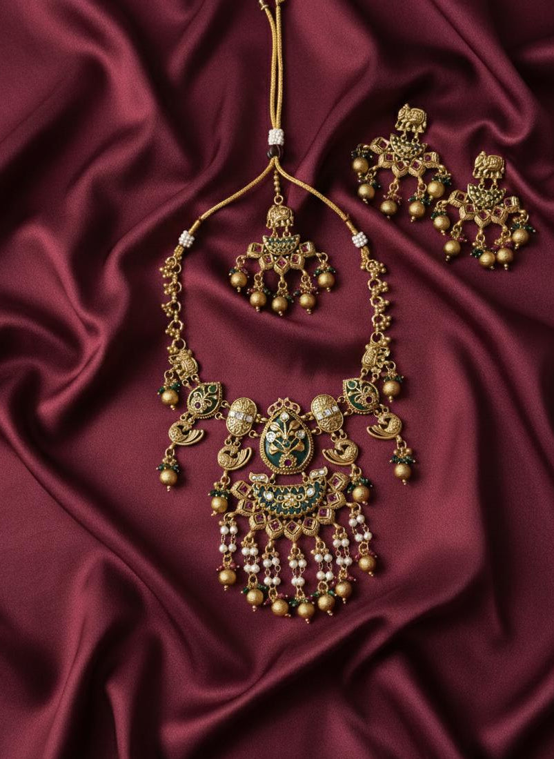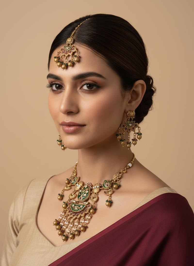 | Complete Bridal Set | Includes matching heavy jhumka-style earrings; ideal for weddings, bridal wear, sarees & silk lehengas |