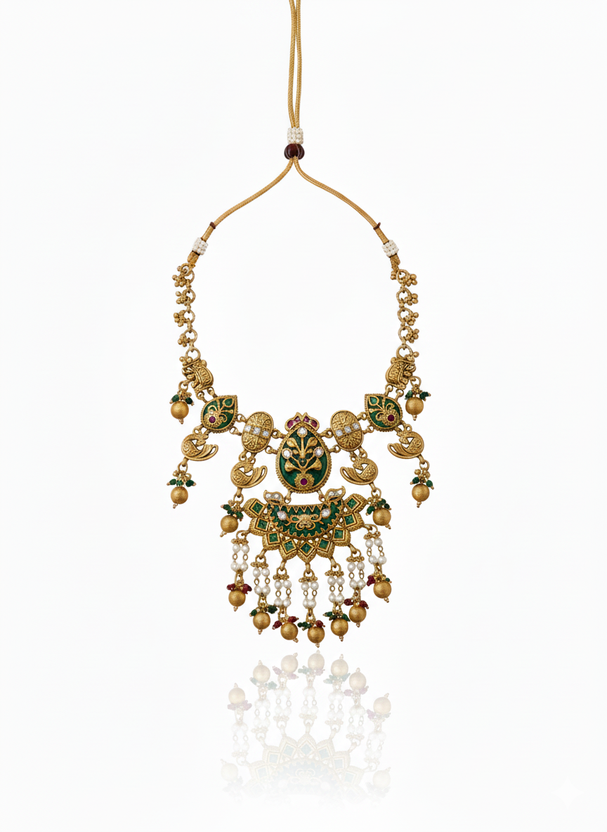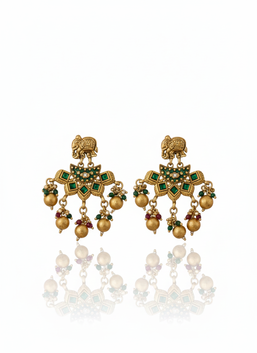 | Premium Stone & Bead Detailing | Embedded with ruby, emerald, and white stones, finished with pearl and gold bead danglers |