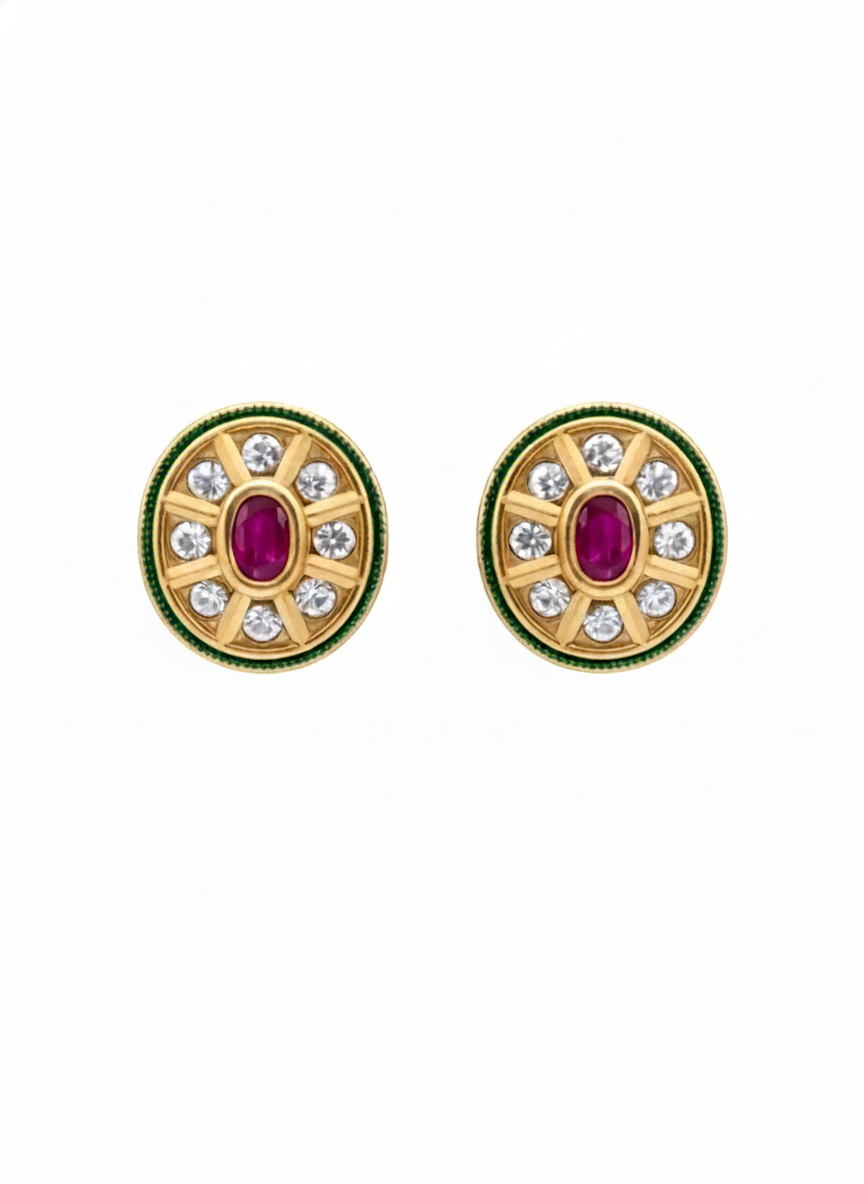 Classic oval Kundan stud earrings featuring a vibrant ruby center piece framed with sparkling white stones and subtle green enamel accents.