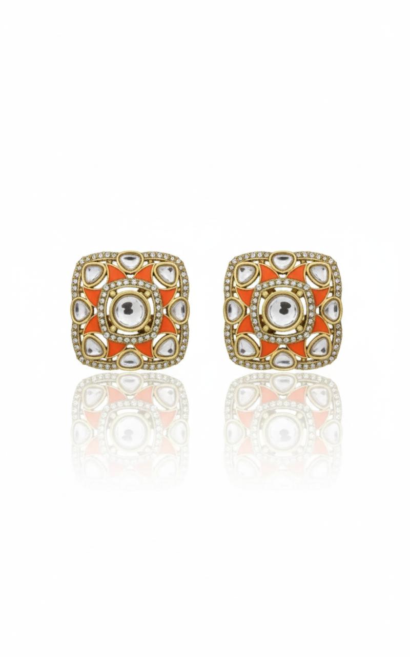 Discover the stunning appeal of these exquisite square stud earrings, where traditional Indian Kundan craftsmanship meets vibrant color. Each piece features dazzling, uncut Kundan stones (Polki style) meticulously set in a beautiful gold-toned base, surrounded by a border of glittering accents. The defining element is the striking enamel (meenakari) work, available in two rich and festive colors: Royal Blue Enamel for a classic, regal look, and Saffron Orange Enamel for a warm, contemporary statement. Lightweight yet impactful, these studs are the ideal accessory for weddings, festive occasions, or cultural events, designed to add instant Maharani glamour and color to your ensemble, complete with a comfortable, secure push-back closure.